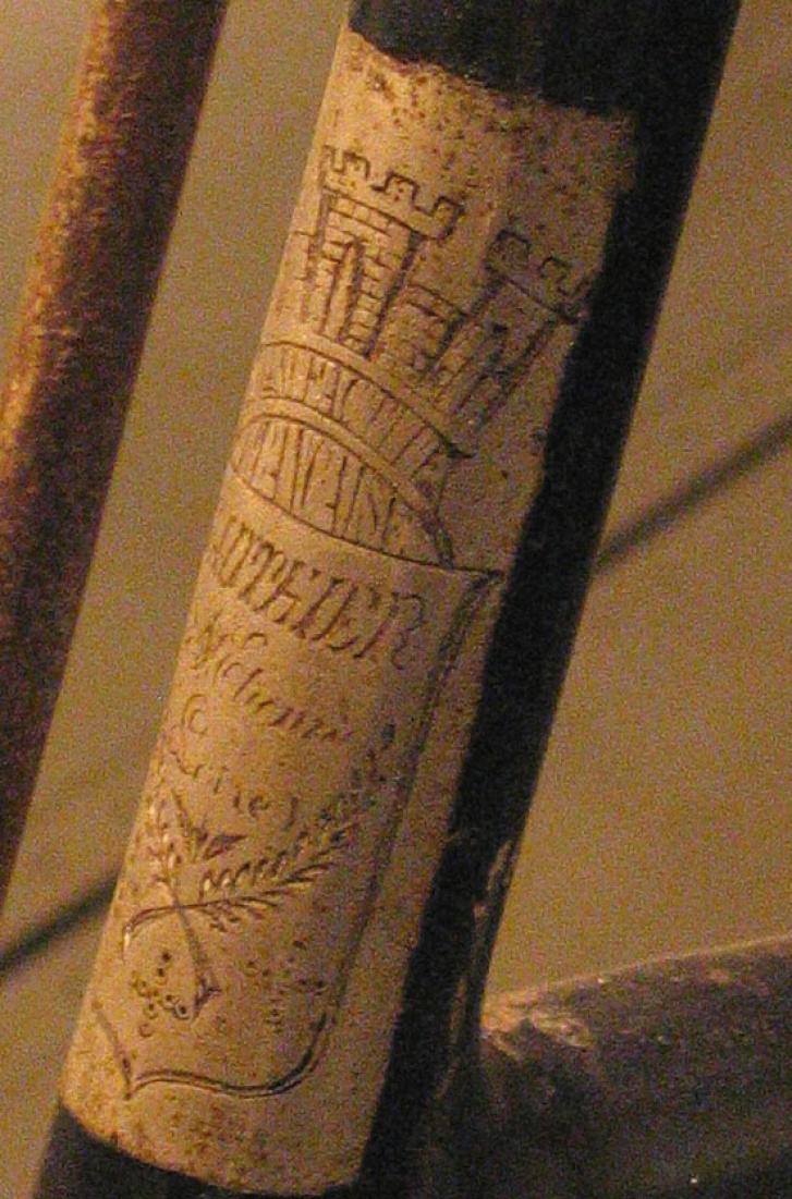 The black paint must have been added later, leaving the head tube badge free. Which is a good thing; otherwise we wouldn't have a clue about the maker, since this bike has a lot in common with other cross frame safeties of the early 1890's.